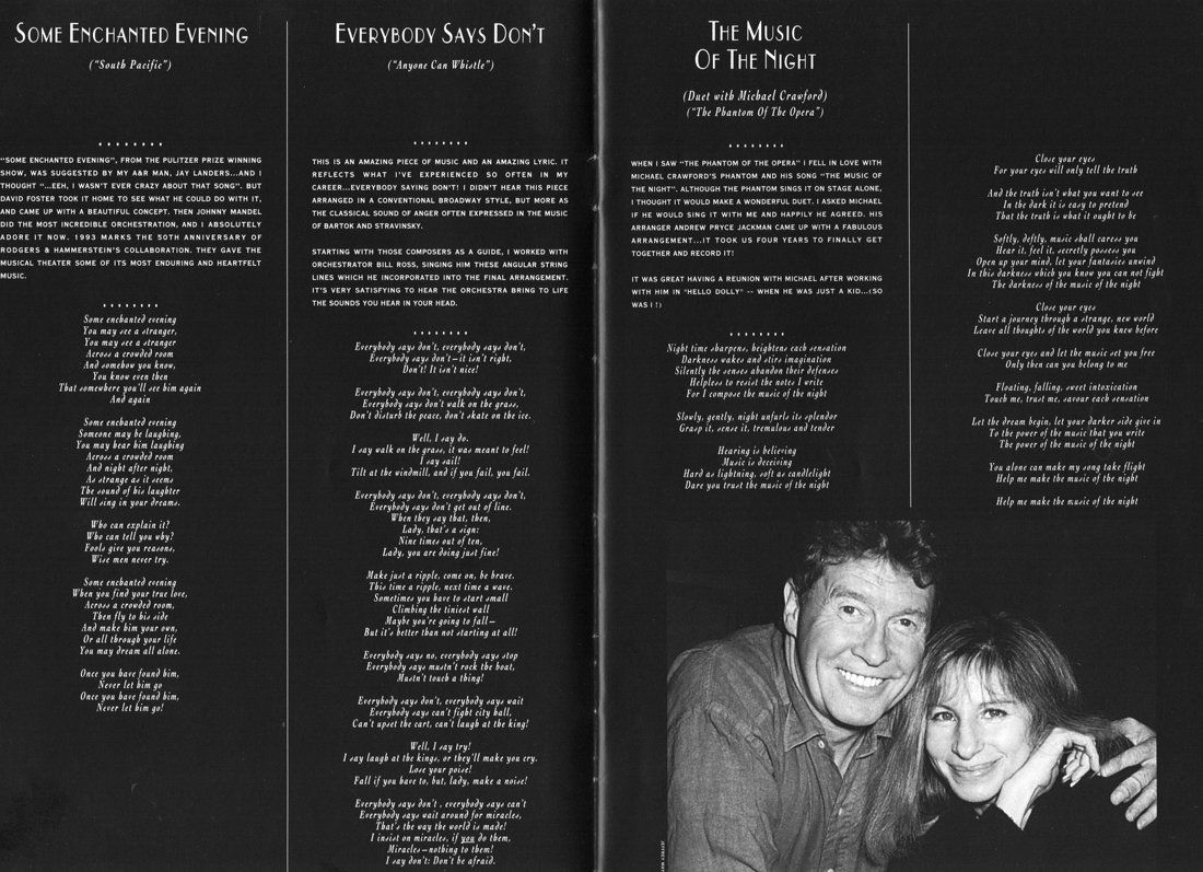 In March 1993, still three months away from the album's release, David Foster talked to the L.A. Times about his work on Back to Broadway with Streisand. “I work on the musical tracks and she works out her own vocals,” Foster said. “She sings them the way she wants to sing them, which is fine with me. Broadway material is not my forte, but it is hers. It's hard for me to say, ‘Barbra, sing it this way.’”