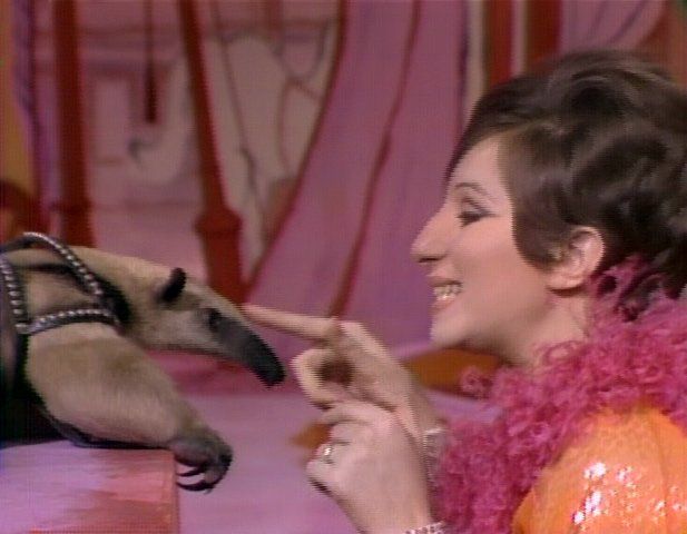 Barbra had to worry not about being trampled to death but when to come in on cue. The show was behind schedule and the overtime was costing the star money. Four electricians chased a pig across the set and damaged part of the backdrop. The only light moment came when Barbra sang to an anteater named Izzy. "He must be Jewish," she said, as they touched noses.