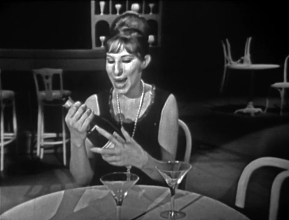 On the show, Streisand stopped at a bar and ordered a glass of champagne from a waiter (played by Bob Harris). As the song progressed, she exchanged earrings and furs as payment.