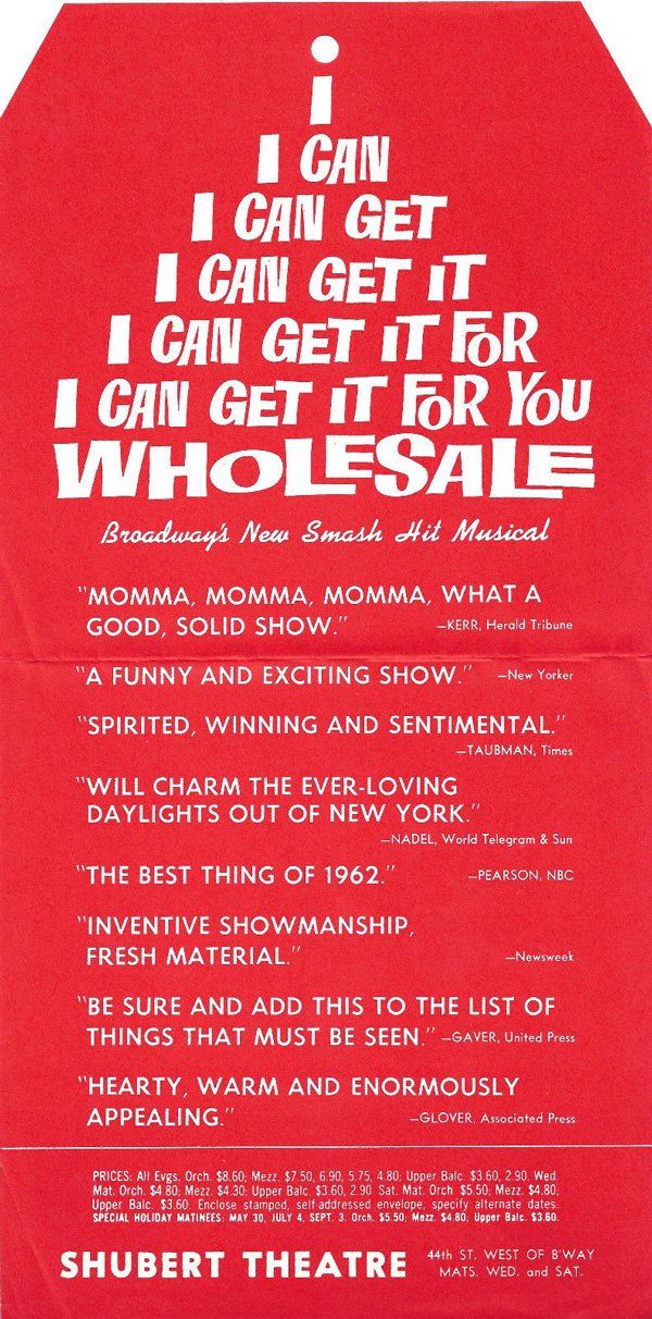 The producer of Wholesale was the notorious David Merrick (whose nickname in the business was “The Abominable Showman”). Merrick was infamous for his publicity stunts, including the one in 1961 when he found seven New Yorkers who had the same names as the seven leading theater critics. Merrick ran newspaper ads for his show, featuring glowing reviews from the critics, who were not actually critics.